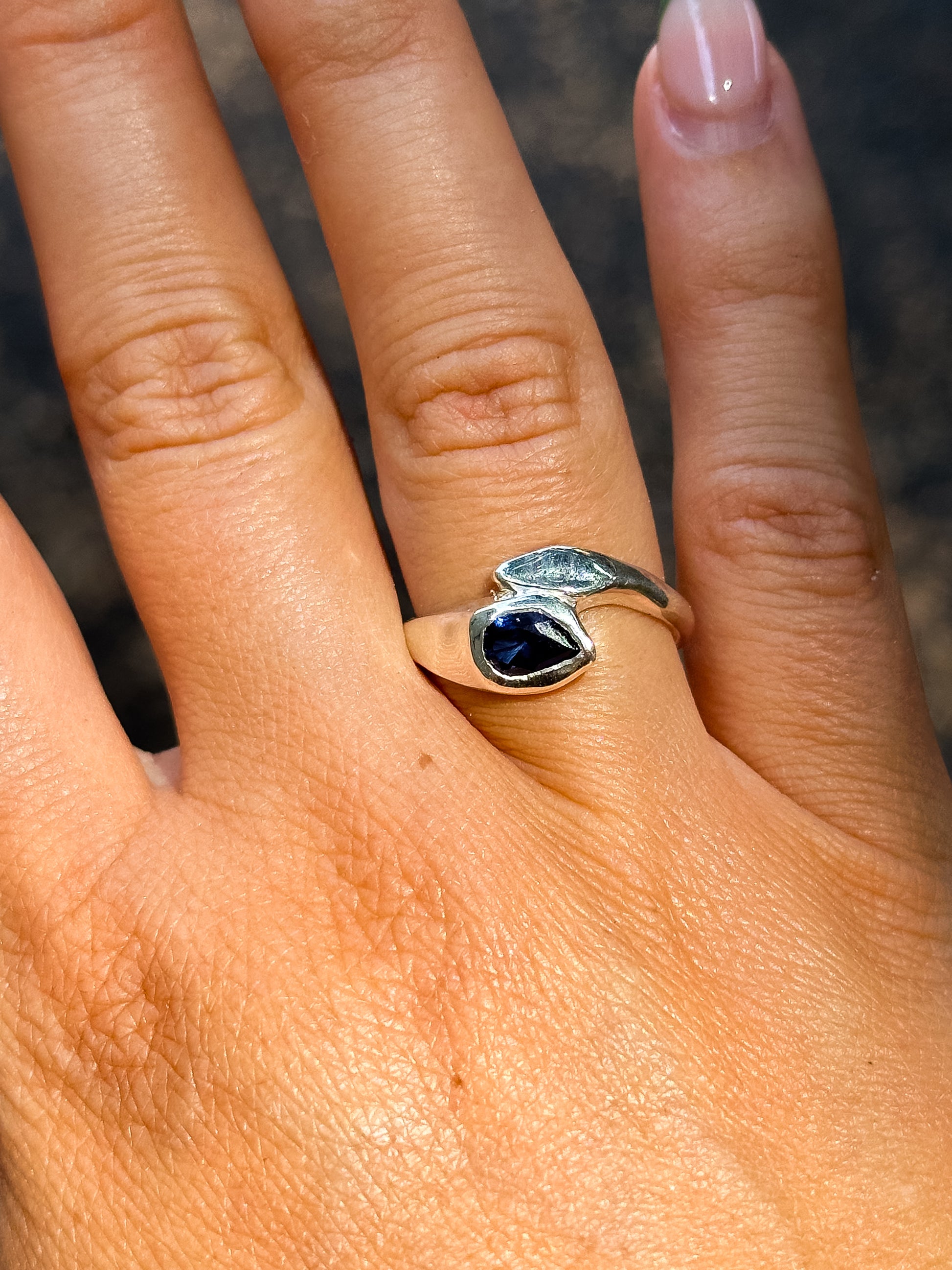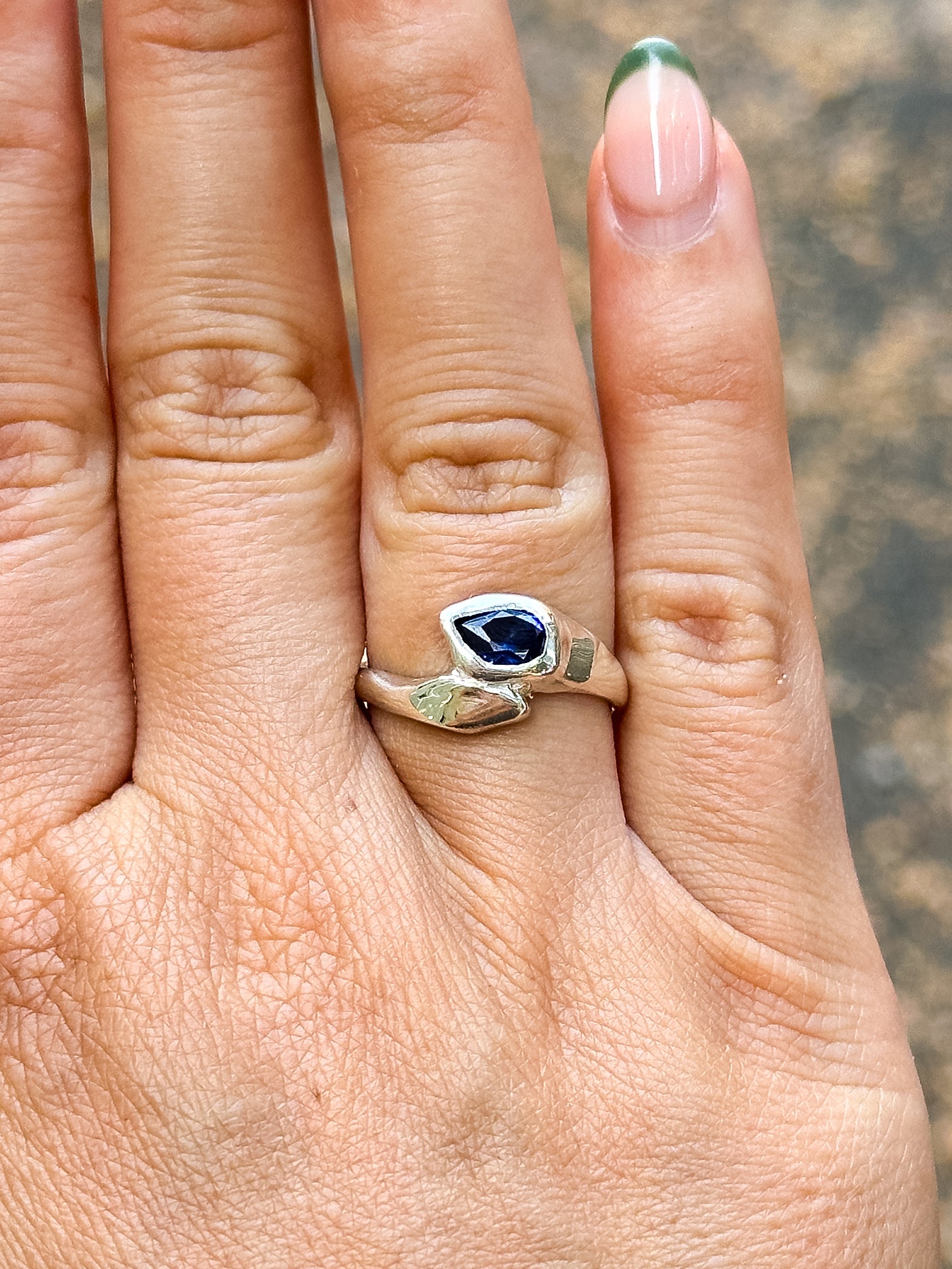 Sterling Silver set with a blue Sapphire.