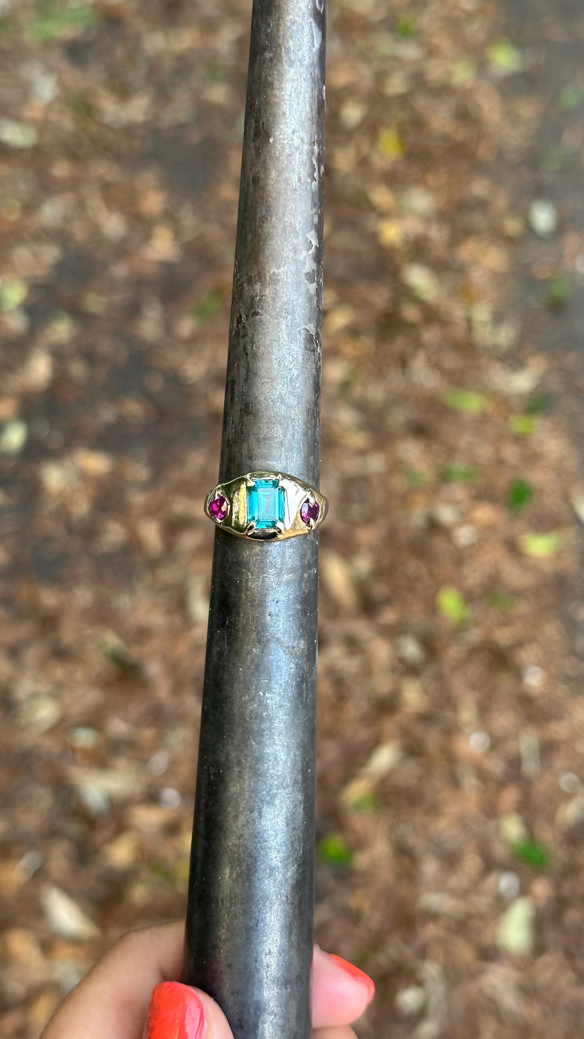 9-carat yellow gold set with a Paraíba tourmaline and two garnets.